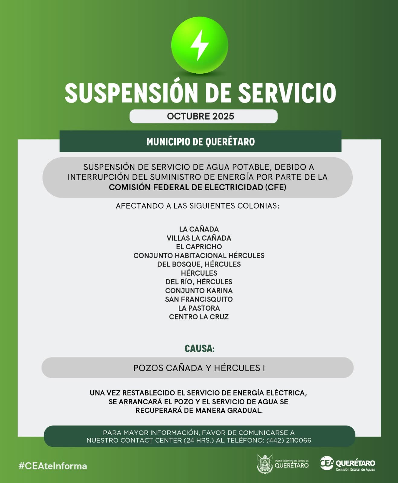 La Comisión Estatal de Aguas (CEA) informó que el suministro de agua potable se suspenderá temporalmente en 11 colonias del municipio de Querétaro debido a la interrupción del suministro eléctrico por parte de la Comisión Federal de Electricidad (CFE).