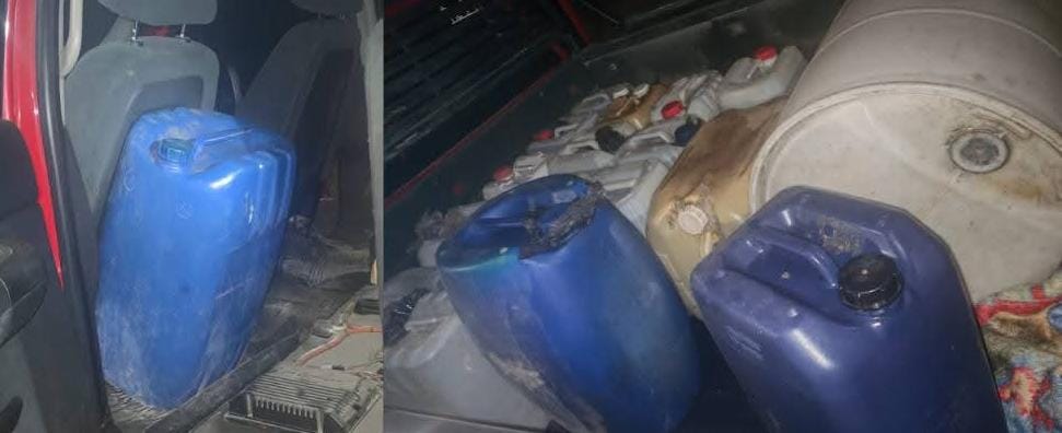 Durante la revisión, los policías localizaron en la batea 16 garrafones de 20 litros, dos garrafones de 40 litros y un tambo de 200 litros, todos cargados con hidrocarburo. El conductor no pudo acreditar la legal procedencia ni la transportación del combustible.