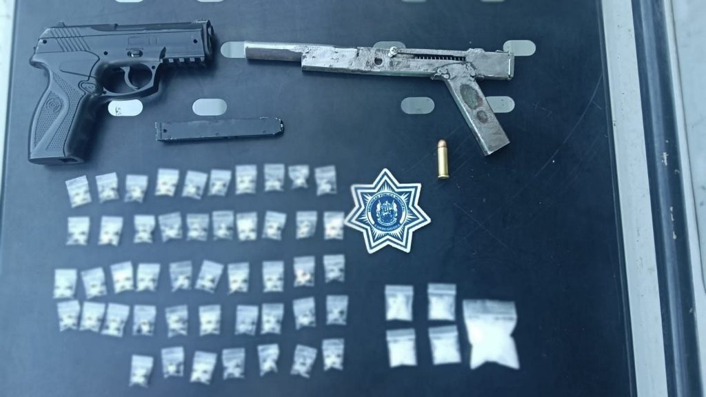 Tras realizar una entrevista preventiva y una inspección de seguridad, los oficiales localizaron entre sus pertenencias más de 50 dosis de una sustancia con características de probable narcótico, así como un objeto con apariencia de arma de postas y un arma de fabricación artesanal.