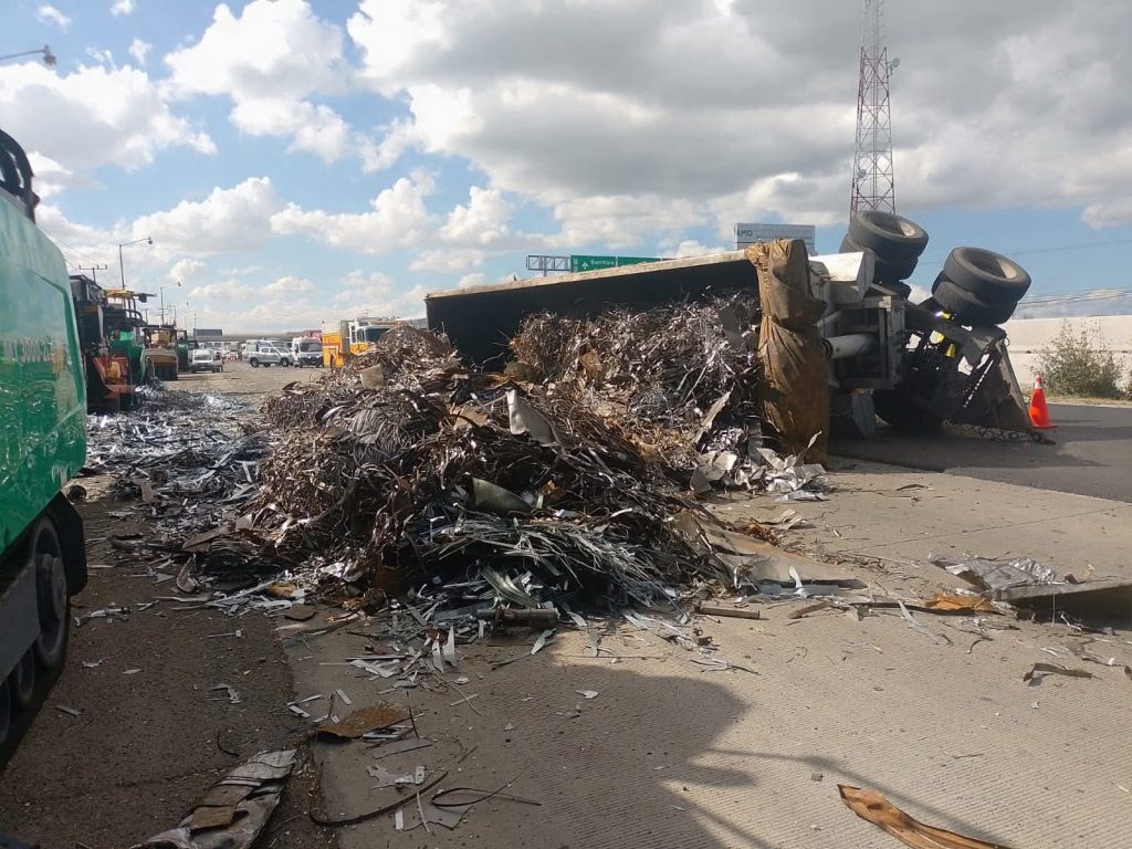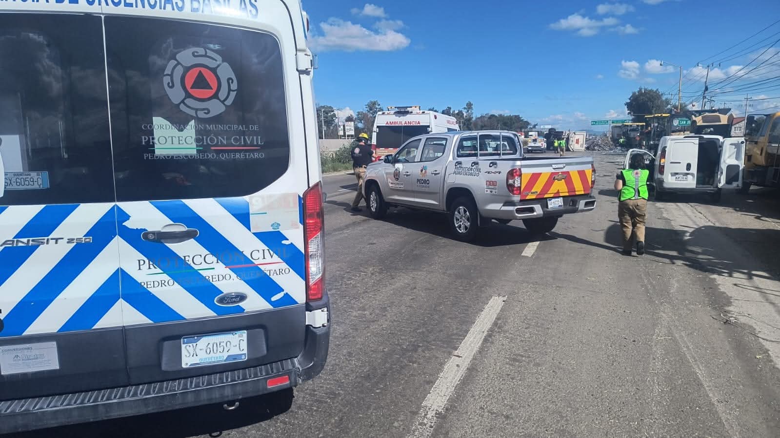 Pedro Escobedo, Qro.— Personal de Protección Civil Municipal y Bomberos se encuentra atendiendo un accidente vial en la carretera, a la altura de La Palma y las Básculas, donde se vio involucrado un camión pesado con remolque que transportaba chatarra.