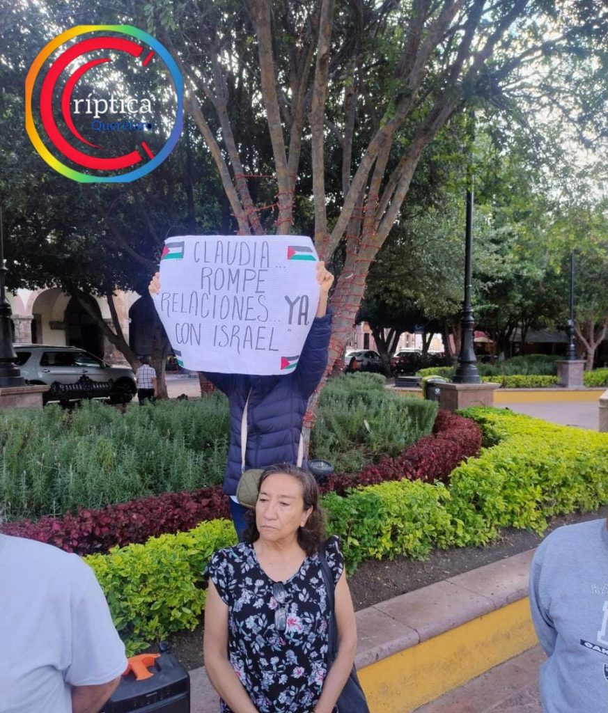 Entre los manifestantes se encontraban representantes de Comida No Bombas Querétaro, Frente Nacional por las 40 Horas, La Zapapacho, Comité Cerezo México, Querétaro con Palestina, Partido Comunista Revolucionario y otras agrupaciones, quienes denunciaron el secuestro de los mexicanos que viajaban en misión humanitaria hacia la Franja de Gaza, incluyendo a Carlos Pérez Osorio, Ernesto Ledesma, Arlín Medrano y Sol González.