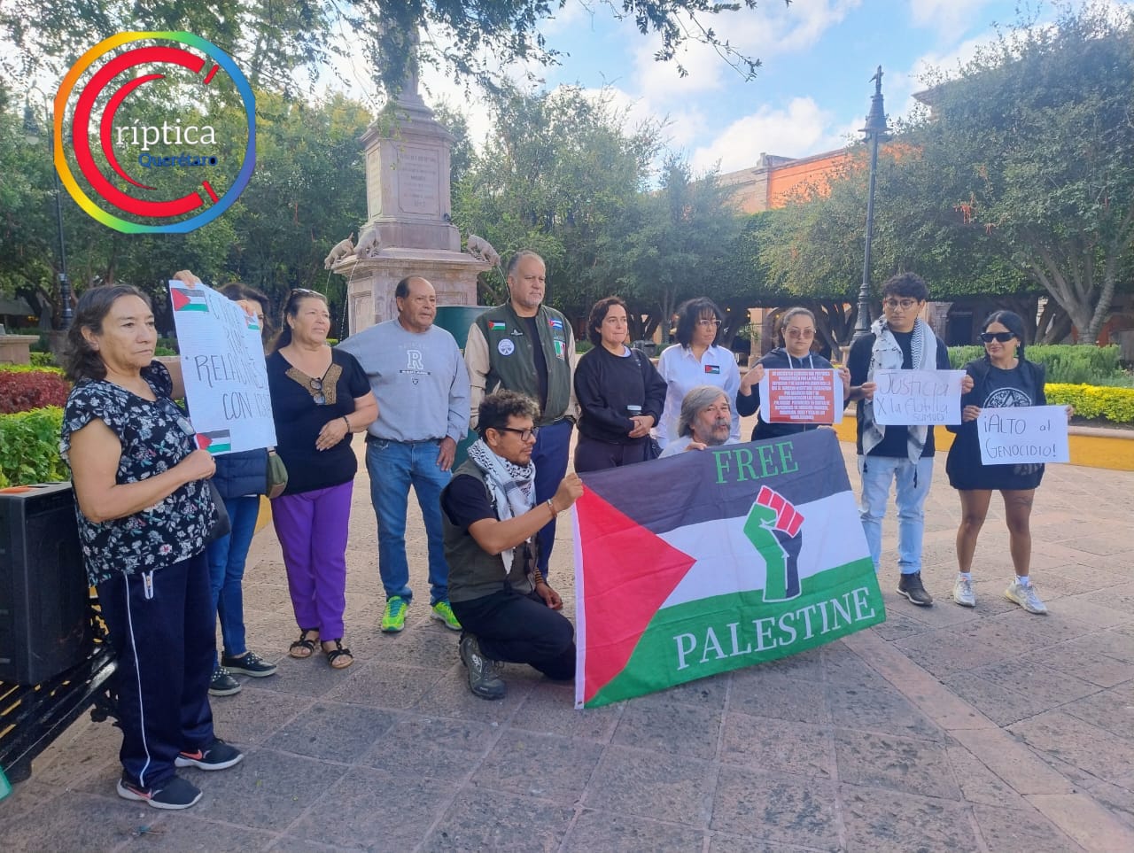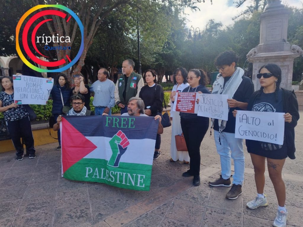 Querétaro, Qro.— Diversos colectivos locales se reunieron este jueves en el centro de Querétaro para manifestarse en apoyo a la flotilla humanitaria Summud y exigir la liberación de siete ciudadanos mexicanos retenidos por el ejército israelí en aguas internacionales.