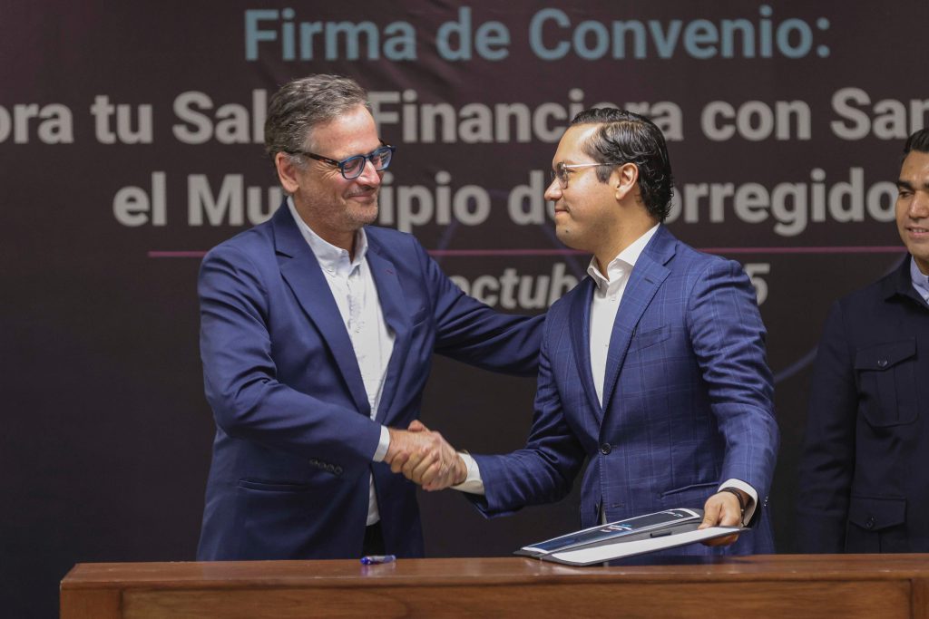 El presidente municipal de Corregidora, Chepe Guerrero y el director ejecutivo de distribución y regionalización de banco Santander México, Antonio Basagoiti, firmaron un convenio para la entrega de mil becas “Salud Financiera” para universitarios, esta iniciativa promueve una mejor administración del dinero, el ahorro y el uso responsable del crédito.