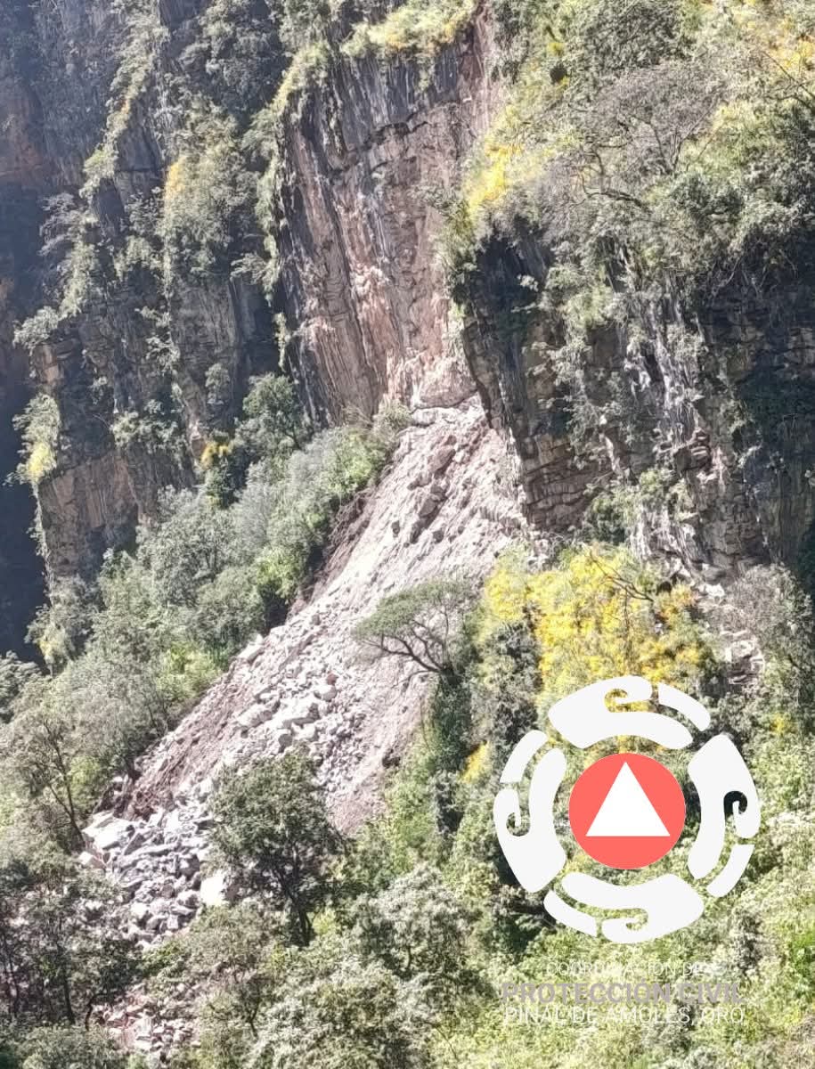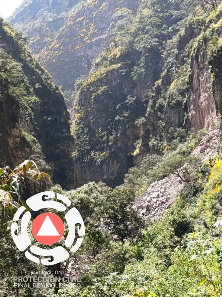 Pinal de Amoles, Qro., 28 de octubre de 2025. — El equipo de Protección Civil acudió al camino conocido como La Gotera, que conecta a Puerto de Amoles con la comunidad de Potrerillos, donde se registró un derrumbre de gran magnitud, aproximadamente a 4 km del ingreso por Puerto de Amoles.