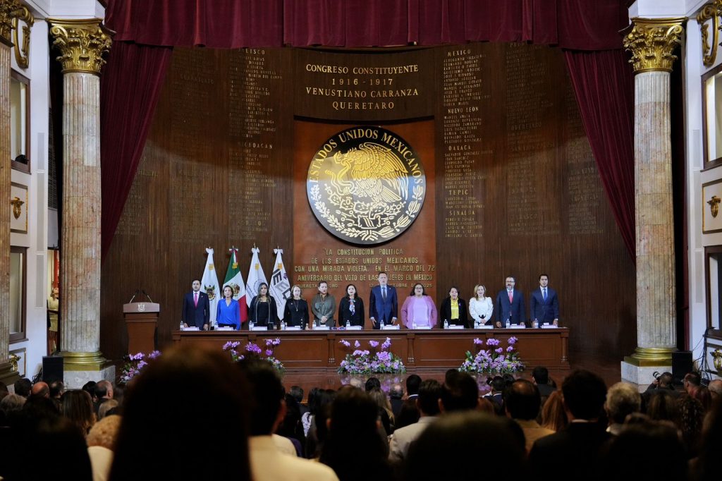 El presidente municipal de Querétaro, Felifer Macías, acompañó al gobernador del estado, Mauricio Kuri González, y a la magistrada presidenta del Tribunal Electoral del Poder Judicial de la Federación, Mónica Aralí Soto Fregoso, en el Conservatorio “La Constitución Política de los Estados Unidos Mexicanos con una Mirada Violeta”, realizado en el Teatro de la República con motivo del 72 aniversario del voto de las mujeres en México.