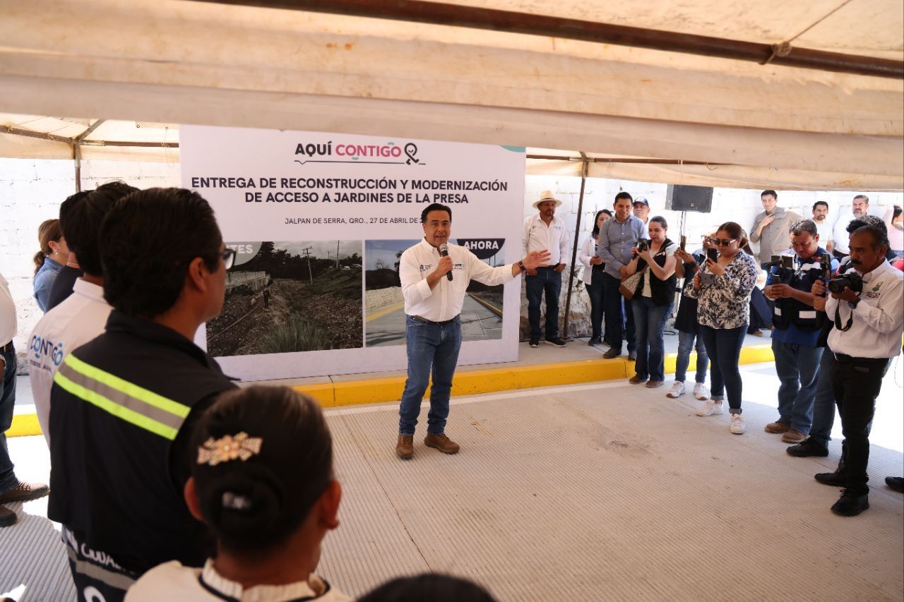 El secretario de Desarrollo Social, Luis Nava, encabezó la entrega de la obra de reconstrucción y rehabilitación de acceso a la colonia Jardines de la Presa, en el municipio de Jalpan, con el objetivo de mejor las condiciones de vida de más de 12 mil habitantes de la zona, acciones en las que se invirtieron 4.5 millones de pesos que representaron la colocación de concreto hidráulico, drenaje pluvial, torrente, banqueta, guarnición y muro de contención.