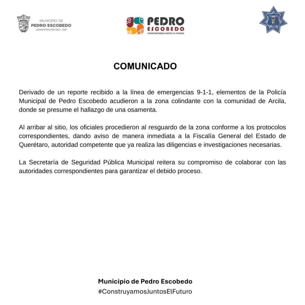 Elementos de la Secretaría de Seguridad Pública Municipal de Pedro Escobedo atendieron un reporte ciudadano que derivó en el hallazgo de una presunta osamenta en una zona cercana a la comunidad de Arcila.