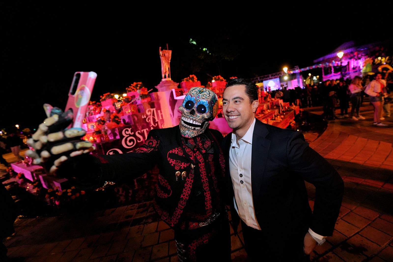 El alcalde recorrió los principales atractivos, como el tapete elaborado con fibras naturales en el pasillo central de la Alameda y el altar monumental que honra a figuras del cine de oro mexicano como Chavela Vargas, Mario Moreno “Cantinflas”, María Félix y Francisco Gabilondo Soler “Cri-Cri”.