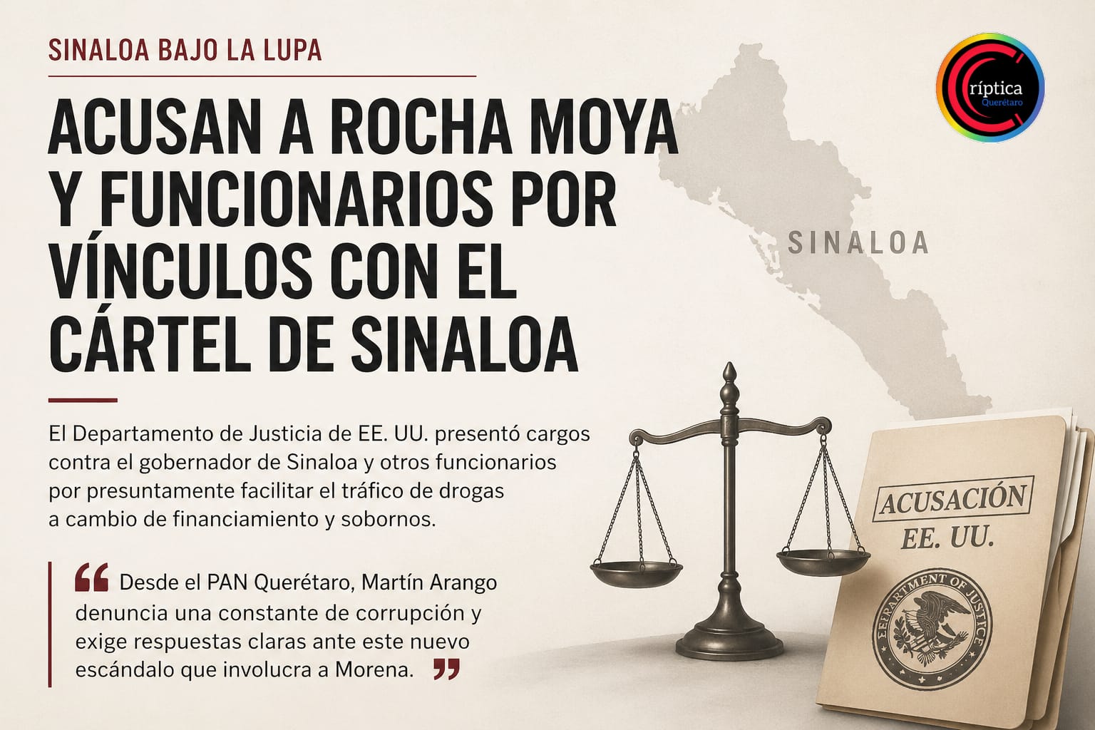El Departamento de Justicia de Estados Unidos formalizó una acusación contra el gobernador de Sinaloa, Rubén Rocha Moya, y otros nueve funcionarios por presuntos vínculos con el Cártel de Sinaloa. Las autoridades estadounidenses sostienen que estos políticos facilitaron el tráfico de fentanilo y otras drogas a cambio de financiamiento electoral y sobornos, utilizando instituciones públicas para proteger las operaciones de la facción de Los Chapitos.