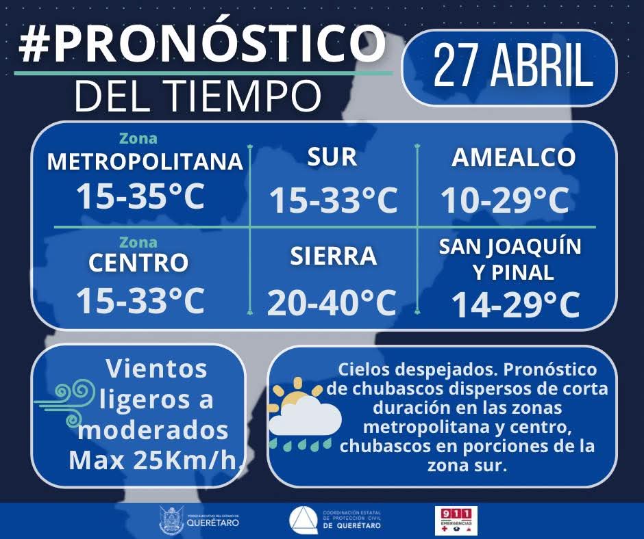 Para la zona sur, se estiman temperaturas de entre 15 y 33 grados, con probabilidad de chubascos en algunas áreas. En el municipio de Amealco de Bonfil, el rango será de 10 a 29 grados, en tanto que en San Joaquín y Pinal de Amoles se esperan temperaturas entre los 14 y 29 grados.