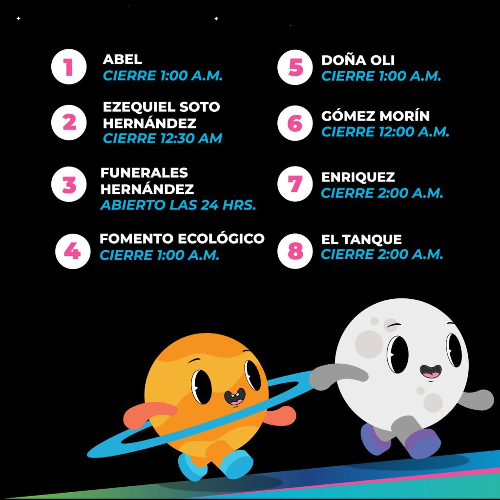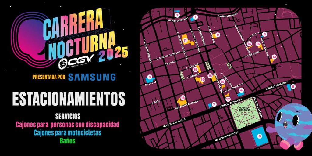 “Por instrucción del alcalde Felifer Macías, informamos que 19 estacionamientos del Centro Histórico estarán ofreciendo servicio para atender la demanda de la Carrera Nocturna este sábado 8 de noviembre, con horarios de cierre entre las 12:00 y las 2:00 de la mañana, y servicio de 24 horas. En total estarán disponibles 2 mil 450 cajones de estacionamiento, de los cuales 115 son para personas con discapacidad. Once estacionamientos se ubicarán dentro del perímetro de los cierres viales, por lo que se invita a la ciudadanía a ingresar antes de las 6:30 de la tarde”, comentó.