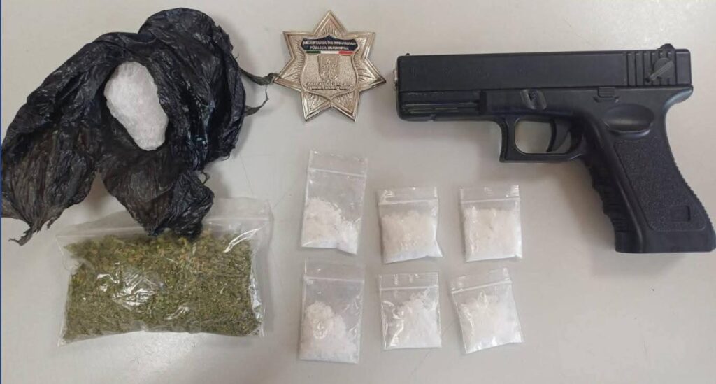 Al realizar la revisión, los oficiales localizaron entre sus pertenencias una bolsa transparente con hierba seca, con características similares a la marihuana, así como seis bolsas tipo ziploc y una bolsa negra anudada que contenían una sustancia granulada cristalina, presuntamente narcótica. Además, se aseguró una réplica de arma de fuego de color negro.