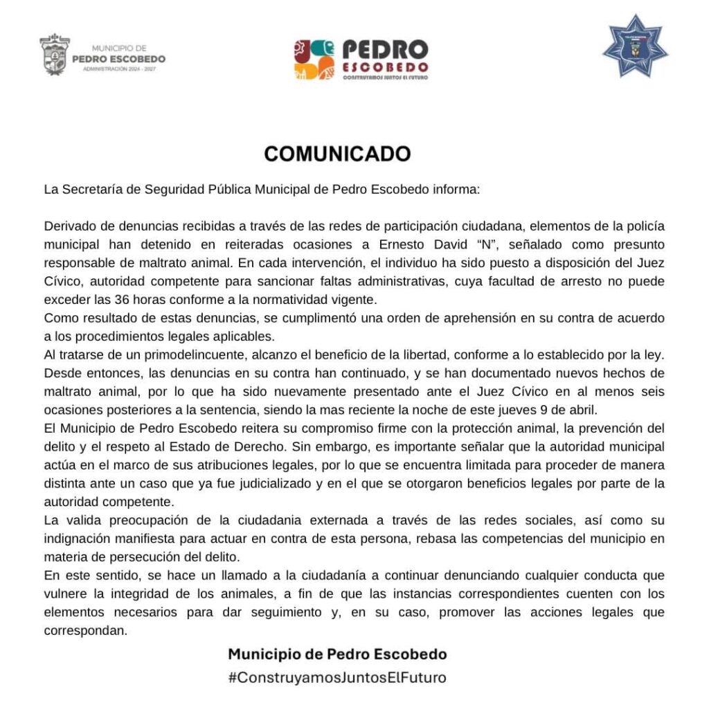 El Gobierno Municipal de Pedro Escobedo reiteró su compromiso con la protección animal, la prevención del delito y el respeto al Estado de Derecho; sin embargo, precisó que su actuación se encuentra limitada a sus atribuciones legales, al tratarse de un caso ya judicializado y en el que se han otorgado beneficios por parte de la autoridad competente.